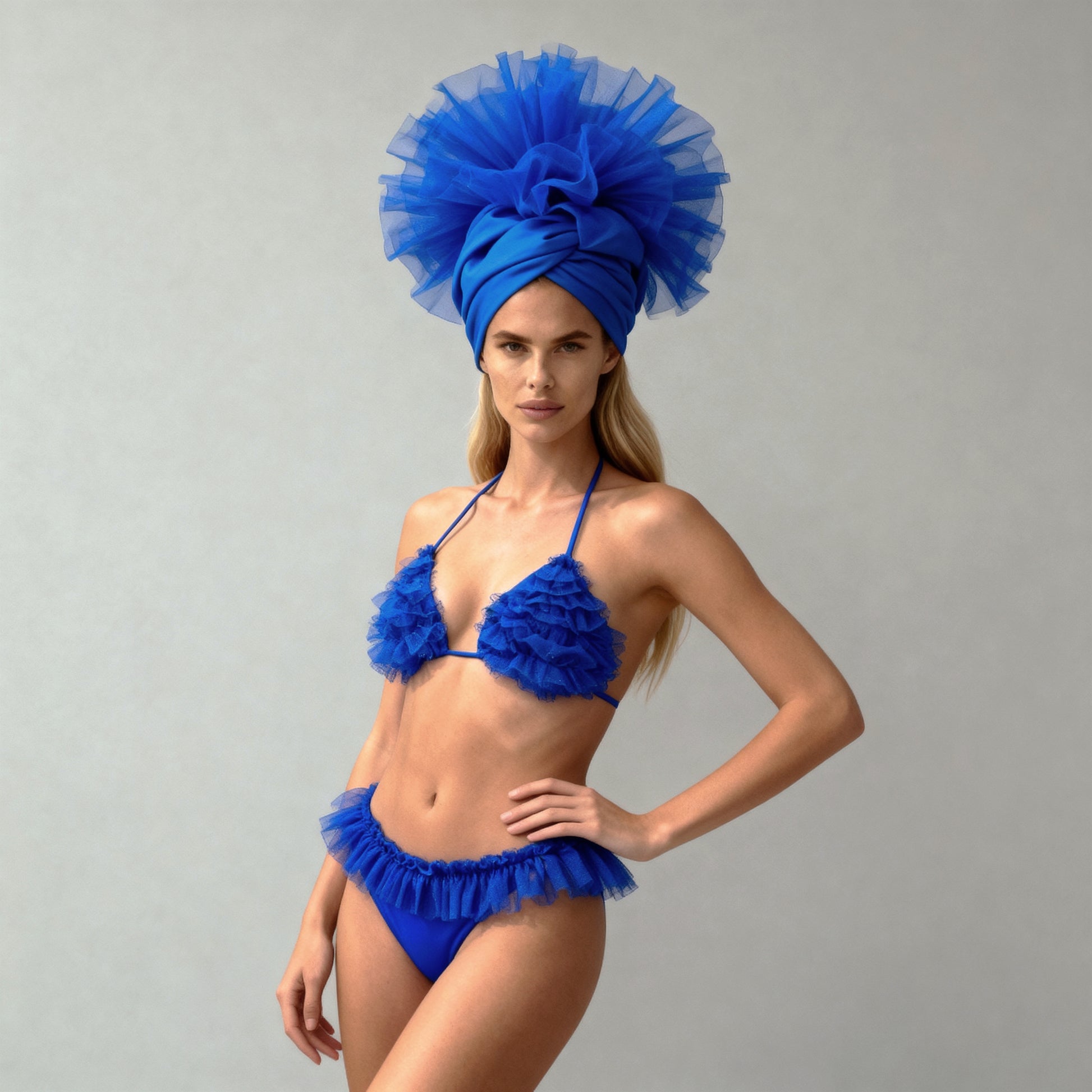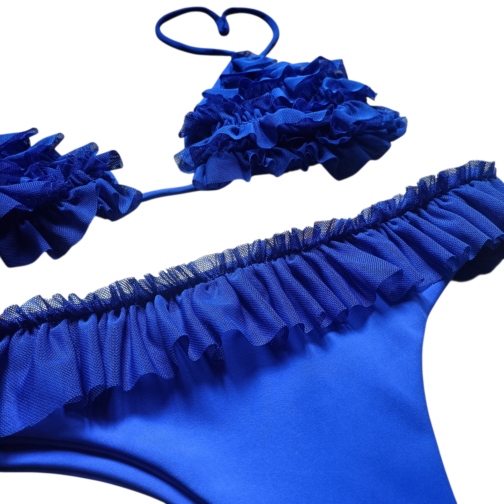 Triangolo scorrevole ideale per coppa 1a-2a, in lycra blu elettrico rifinito con rouches in tulle dello stesso tono. Lo slip brasiliano con rouches segue naturalmente le linee del corpo.