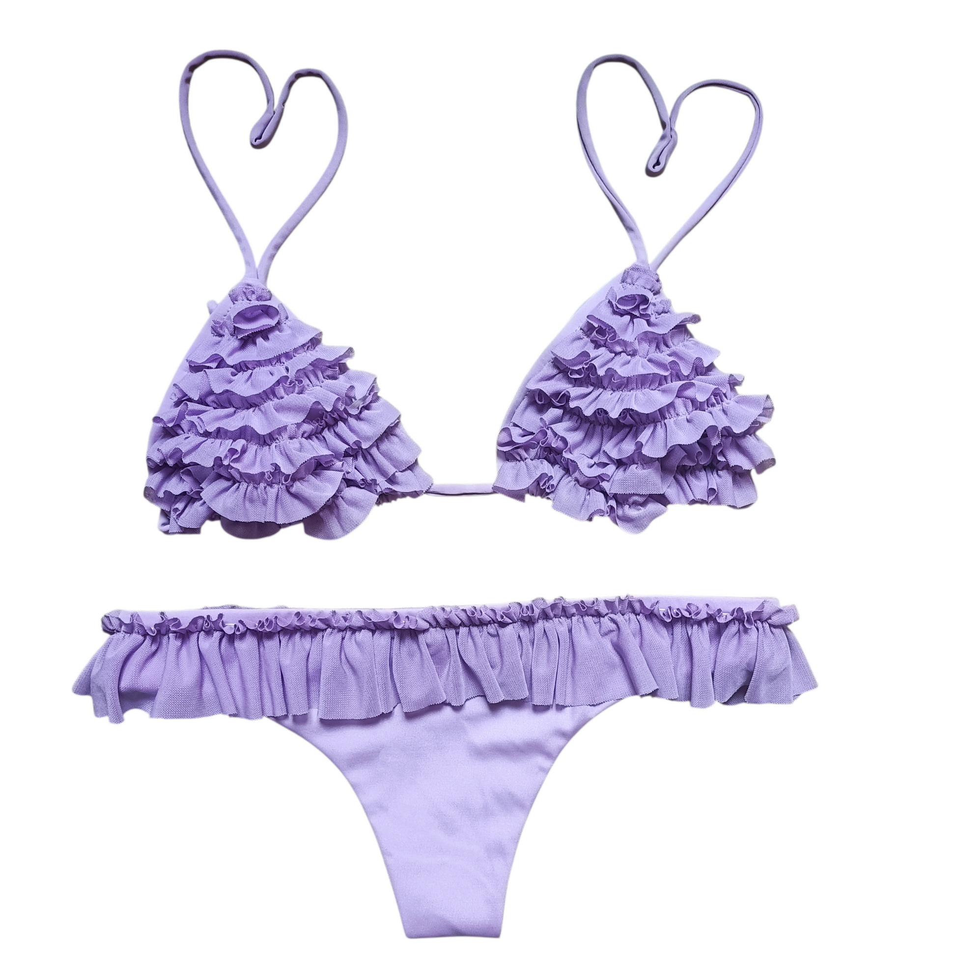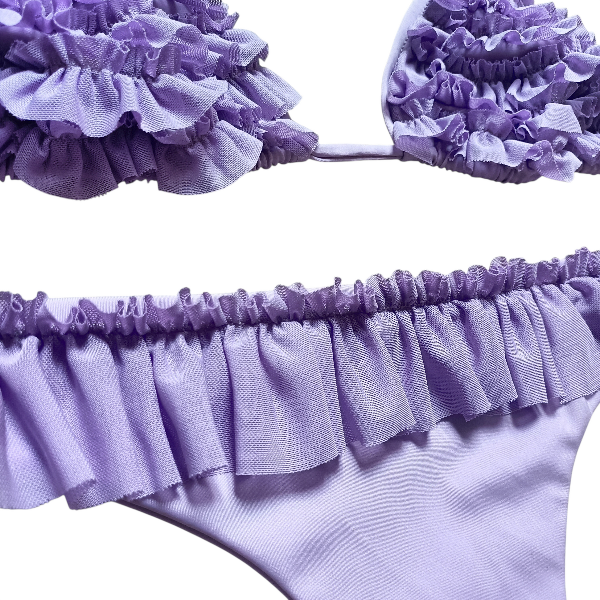 Triangolo scorrevole ideale per coppa 1a-2a, in lycra lillà rifinito con rouches in tulle dello stesso tono. Lo slip brasiliano con rouches segue naturalmente le linee del corpo.