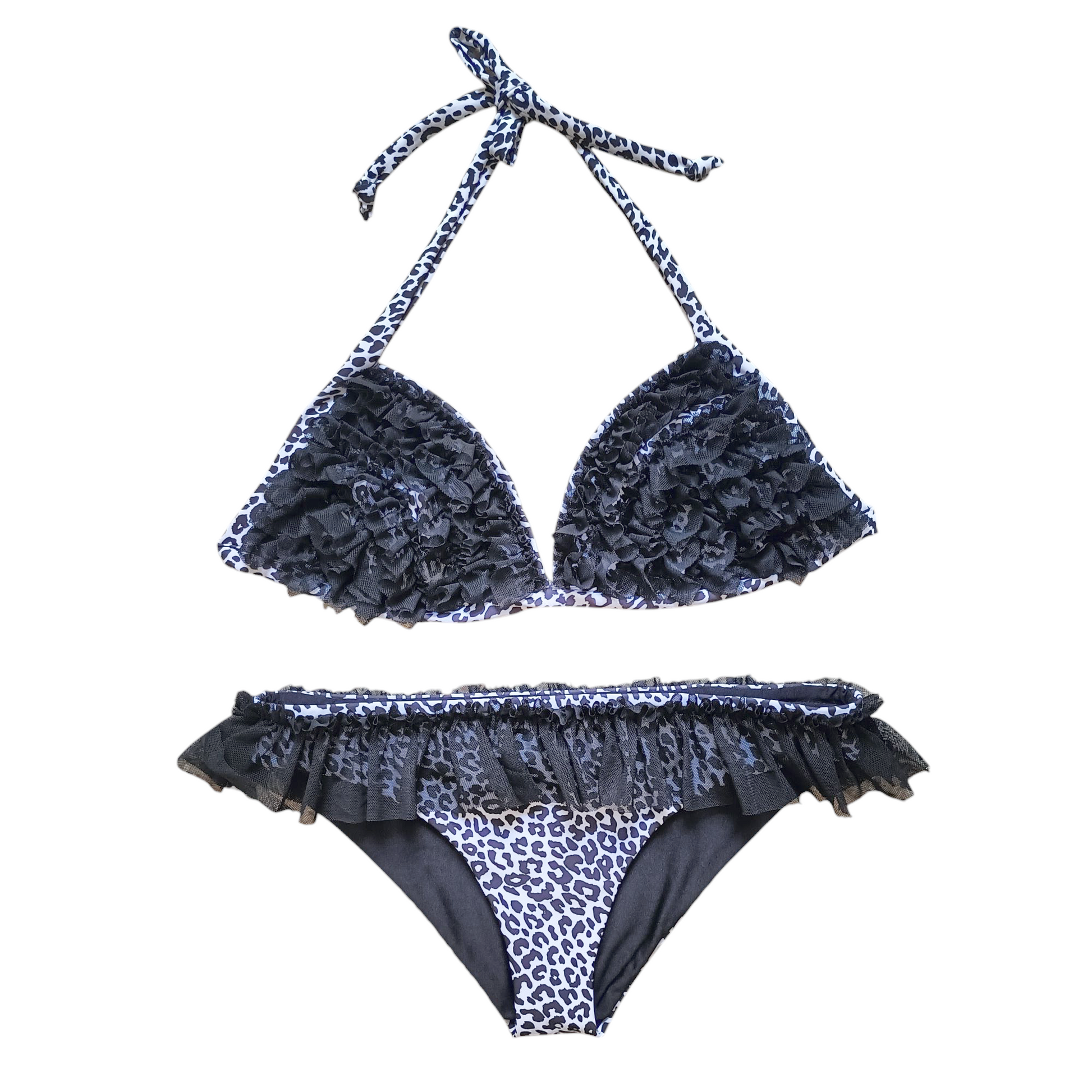 Triangolo fisso in lycra fantasia leopardo bianco e nero ricoperto con rouches in tulle luxury morbidissimo nero.