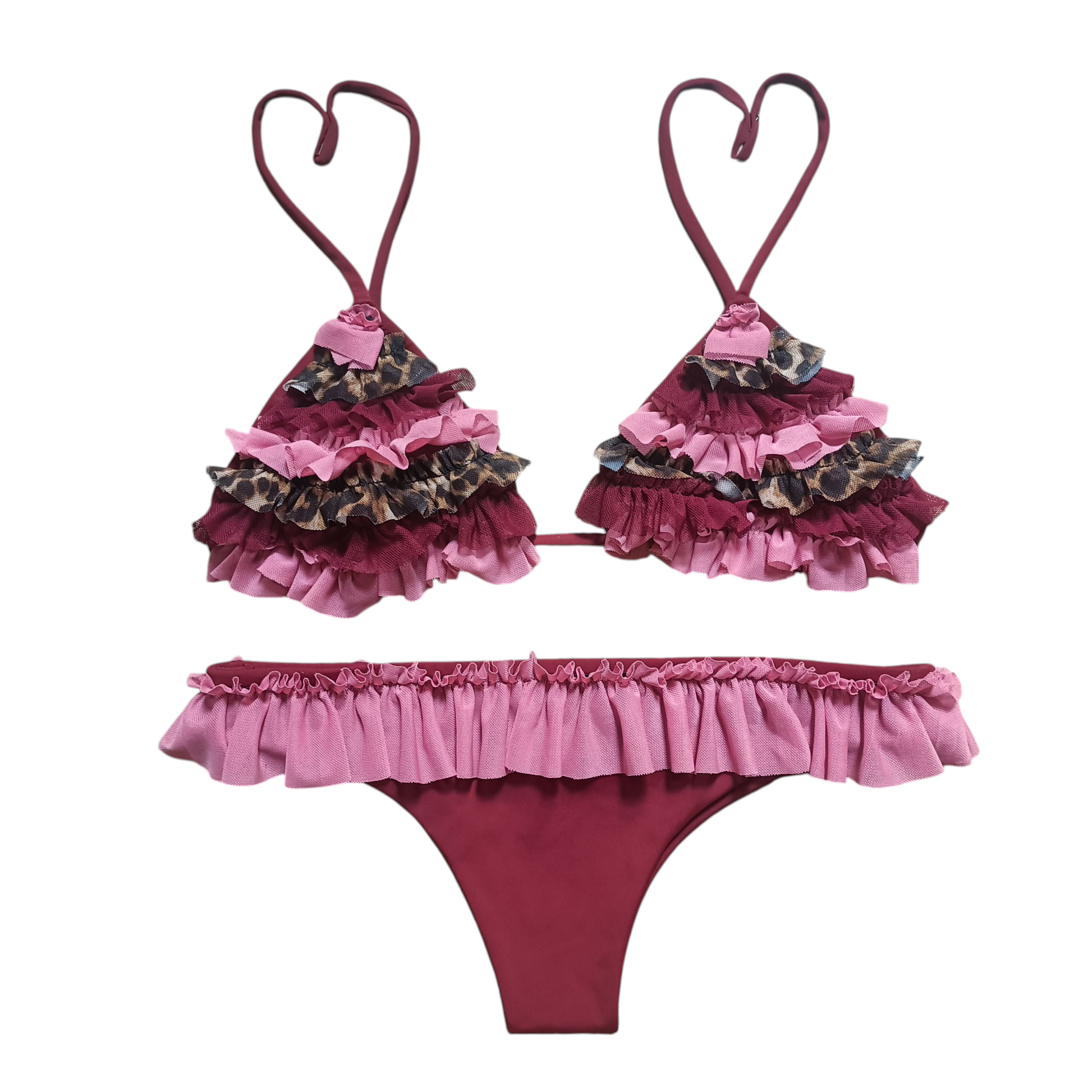 Triangolino scorrevole in lycra color barolo ricoperto di rouches in tulle luxury morbidissimo rainbow: rosa antico, leopardo e barolo
